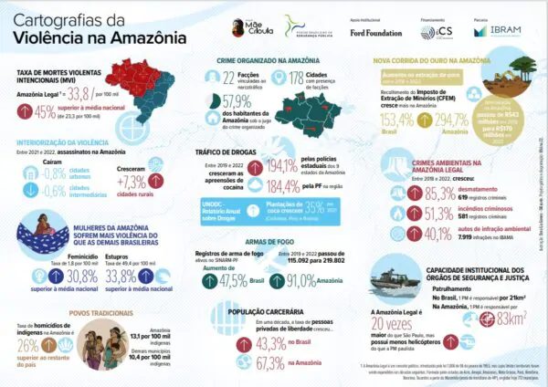 Em sua 3ª edição, o Cartografias da Violência na Amazônia apresenta um cenário preocupante de conflitos em torno do controle, uso ou posse da terra que têm produzido homicídios e outras dinâmicas criminosas, bem como danos irreparáveis à biodiversidade amazônica, causando danos à manutenção da floresta e à sobrevivência de povos indígenas, quilombolas e comunidades ribeirinhas. Tais conflitos podem ser produzidos em função da lógica de exploração e uso da terra, como o desmatamento e a grilagem para o avanço da monocultura, da agropecuária, para a extração ilegal de minérios em garimpos, ou pelo controle territorial armado exercido pelas facções criminais para o varejo e/ou transporte de drogas e outras mercadorias. Seja como for, esta terceira edição do Cartografias das Violências na Amazônia deixa explícito que, por meio sobretudo do controle sobre o uso da terra e de territórios, as organizações criminosas já dominam setores estratégicos da infraestrutura crítica da região, entendida como o conjunto de sistemas, instalações e ativos essenciais para o funcionamento da sociedade e da economia.
